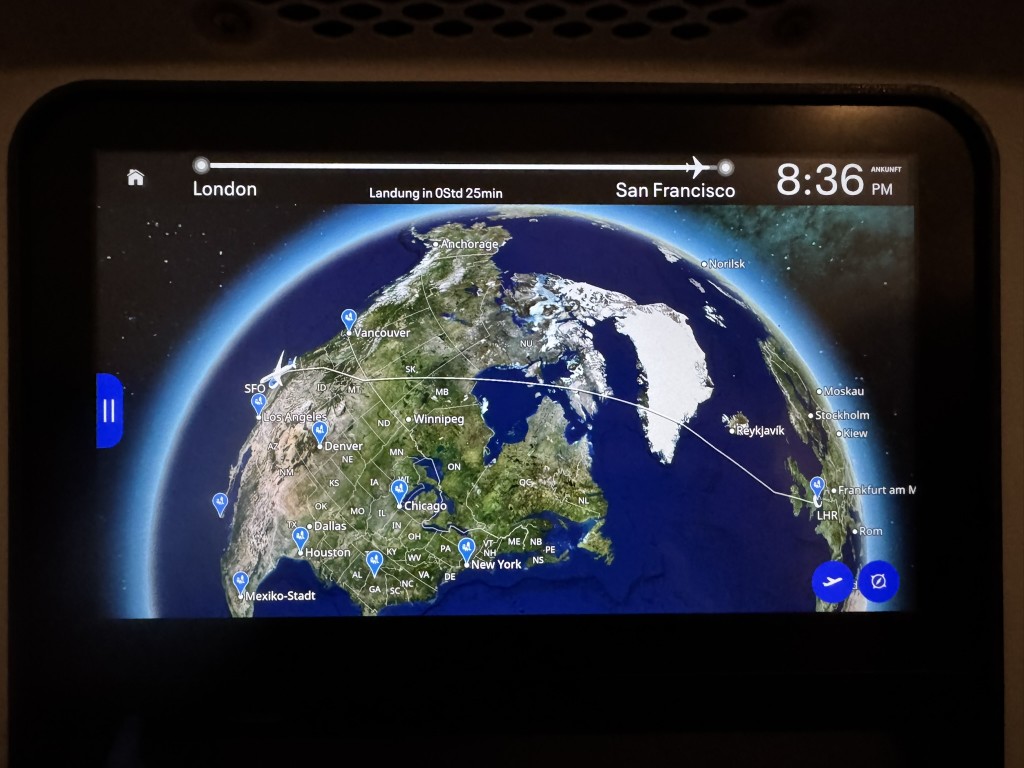 Nach knapp 1,5 Stunden folgte dann gegen 15:00 Uhr die Landung in London und die Wartezeit auf den Anschlussflug in Richtung San Francisco begann. Leider verzögerte sich der Abflug um etwas mehr als eine Stunde, so dass wir erst gegen 17:45 Uhr wieder abgehoben sind.