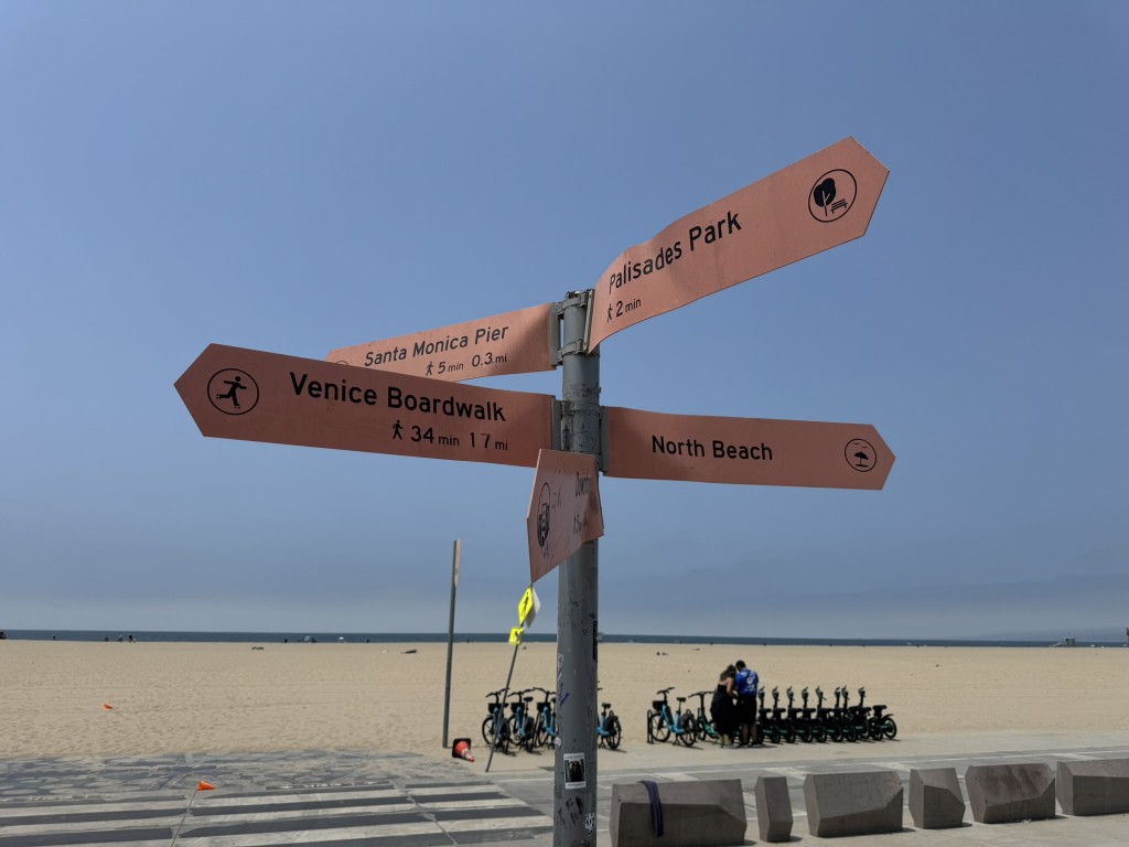 Der heutige Start in den Tag begann, aufgrund etwas längerer (und notwendiger) Schlafenszeit, mit einem strammen Spaziergang zum Abfahrtpunkt unserer Bustour. Das Wetter war super, kein Wind und mit angenehmen 23°C nicht zu heiß. Die Bustour startete mit der „roten Route“, die den ersten Teil von Los Angeles über West Hollywood abdeckte. Wir sind dann in der Station 7 („Beverly Gardens Park“) in die „blaue Route“ umgestiegen, da diese speziell die Strandabschnitte abfährt.
