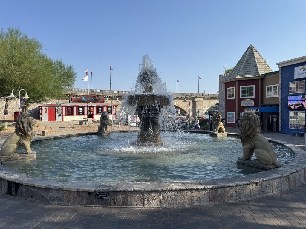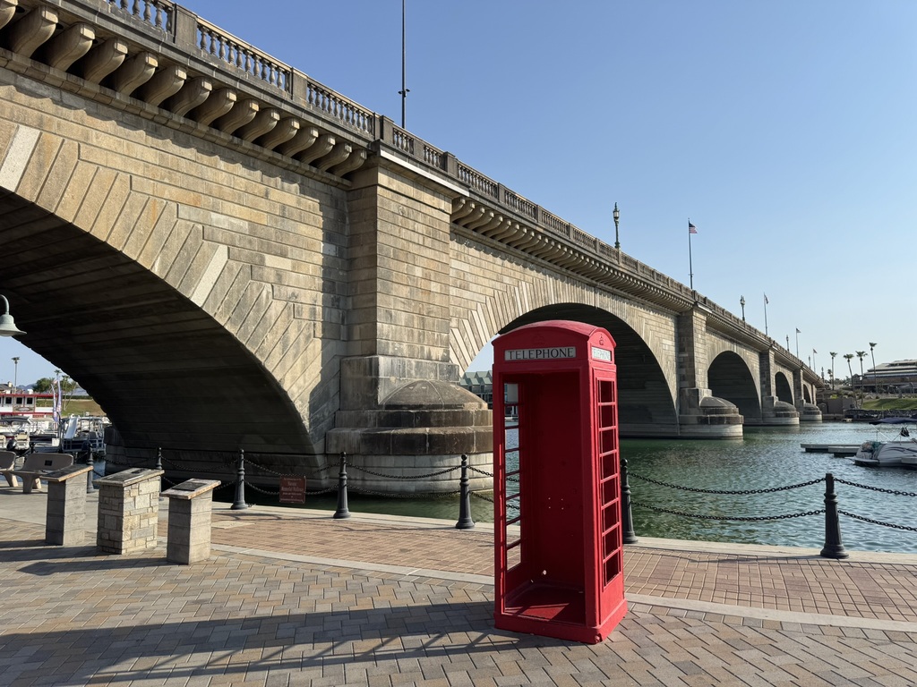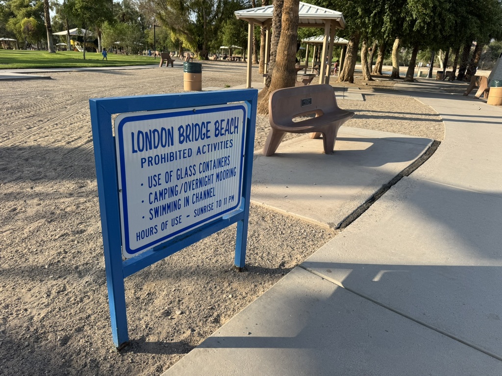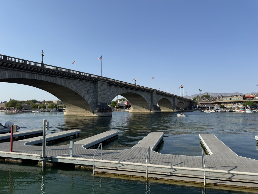 Angekommen in Lake Havasu (es waren mittlerweile schon 43°), haben wir schnell die Koffer aufs Zimmer gebracht, die Badesachen angezogen und sind über die „London Bridge“ zum „London Bridge Beach“ gelaufen. (Die Brücke wurde damals von einem Amerikaner gekauft, dann Stein für Stein in London abgebaut und mit einem Stahlgerüst in Lake Havasu City wieder aufgebaut.)
