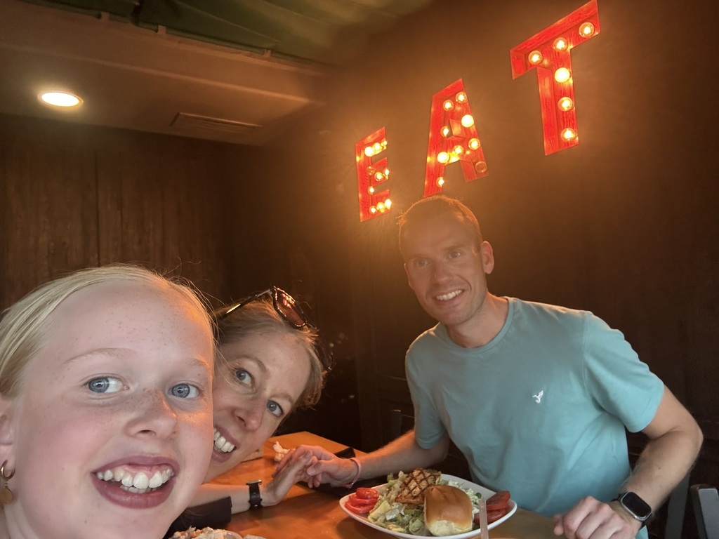 Im Restaurant hatte Papa einen Salat mit Lachs, Mama Spareribs und ich einmal zwei kleine Burger und zwei Toast mit geschmolzenem Käse von der Kinderkarte. (Es war alles sehr lecker :))