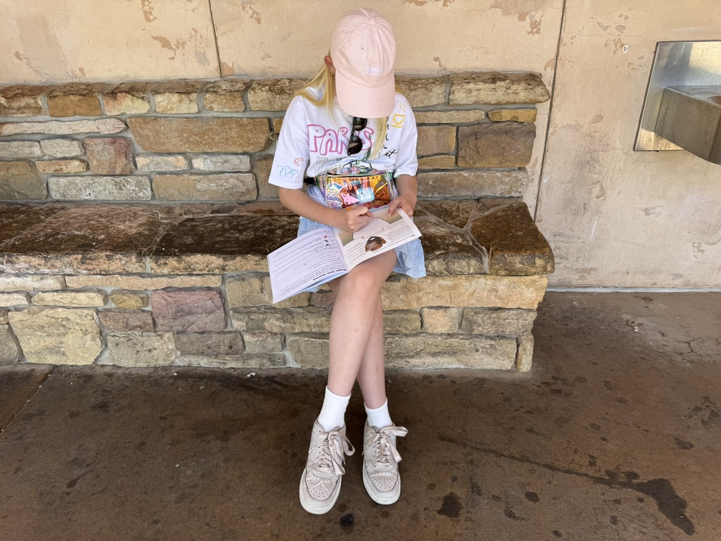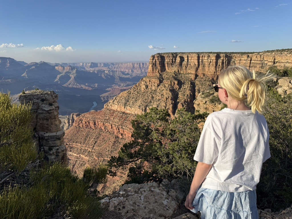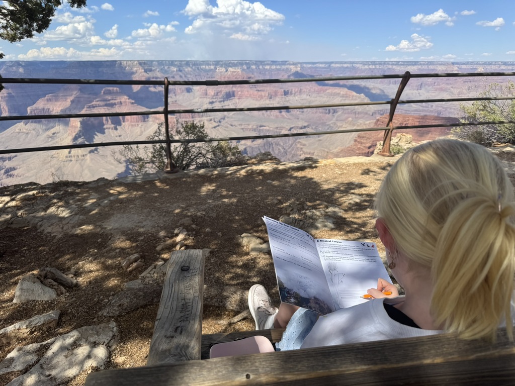 Unser Hotel liegt nur ca. 5 Minuten vom „South Rim“ des Grand Canyons, so dass wir direkt nach dem Frühstück erneut zum „Grand Canyon Visitor-Center“ gefahren sind. Helene hat hier ein Junior Ranger-Aufgabenbuch bekommen, in dem einige interessante Aufgaben und Fragestellungen zum Canyon sind.