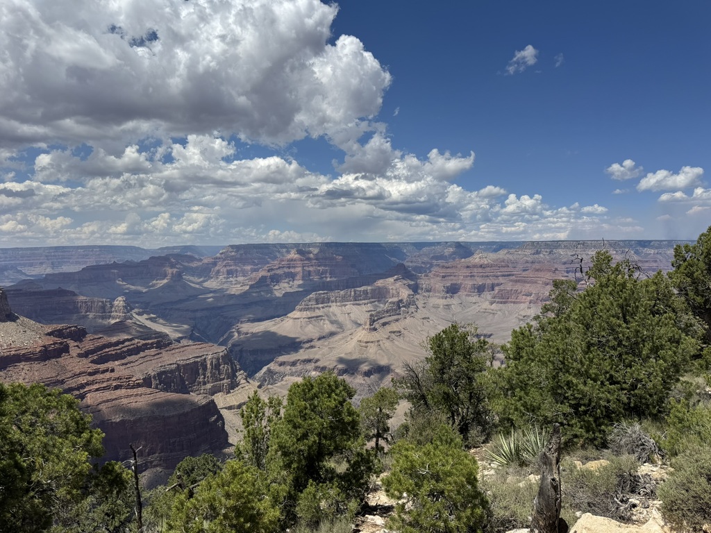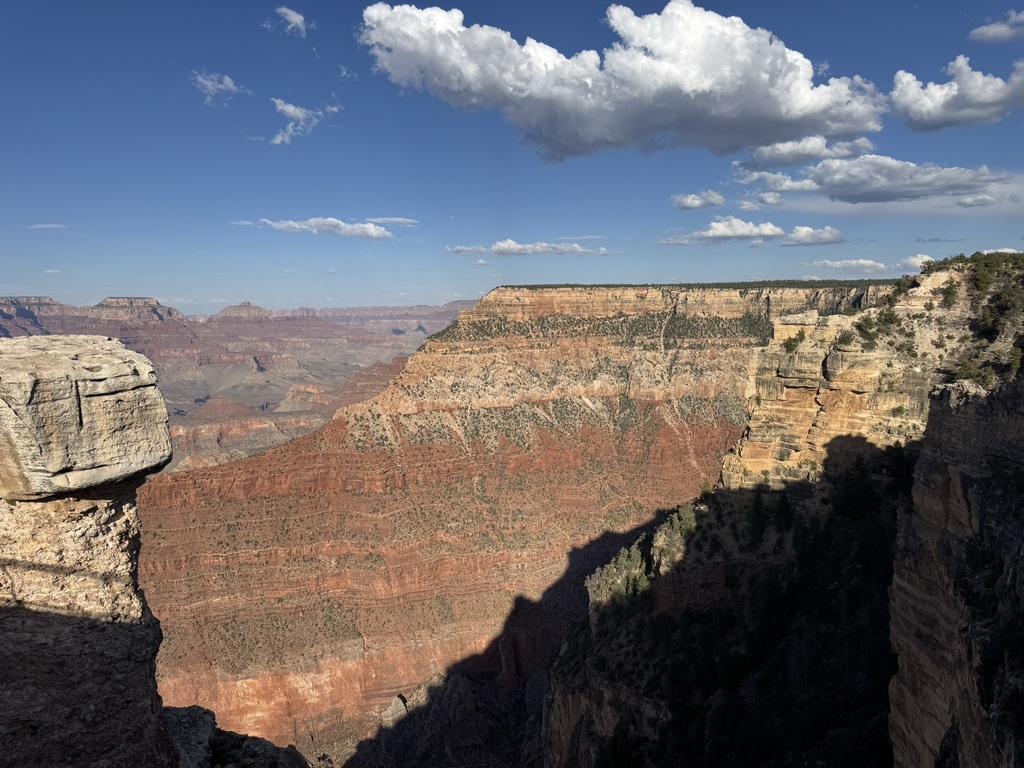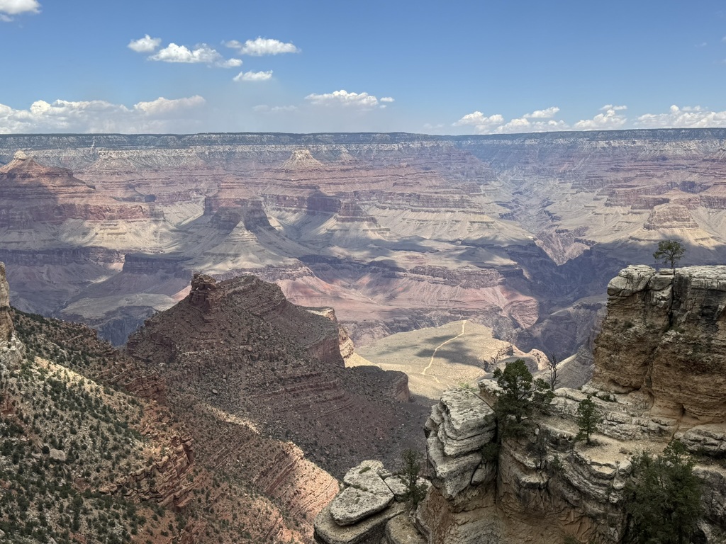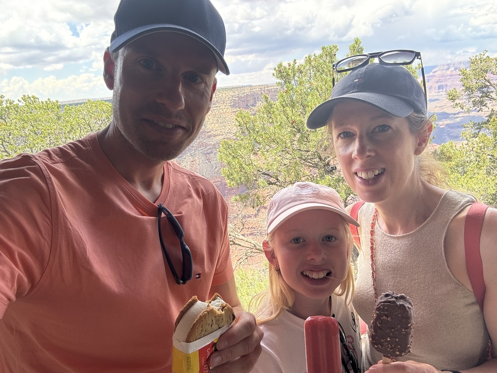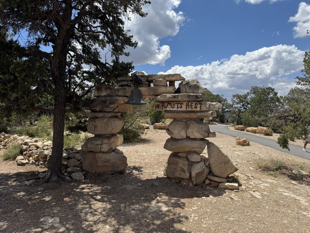 Den Shuttle-Bus haben wir dann am höchsten Punkt der Route, dem Hermits Rests, verlassen. Eingedeckt mit kühlen Getränken und leckerem Eis aus dem Shop, haben wir uns dann auf eine etwa einstündige Wanderung entlang des Canyons begeben. Da viele Besucher des Canyons lediglich die Strecken mit dem Bus abfahren, hatten wir immer wieder Chancen, ganz alleine an tollen Aussichtspunkten zu sitzen und hierbei den Inhalt unseres Rucksacks leer zu essen bzw. zu trinken.