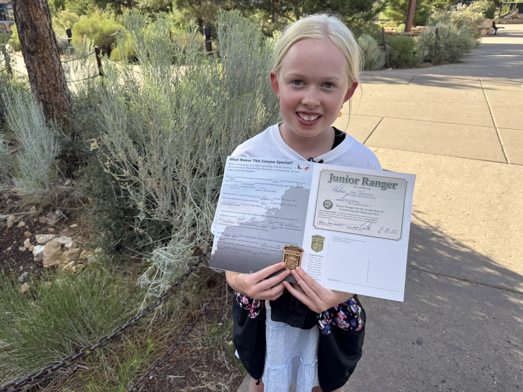 Nach knapp 5 Kilometern haben wir uns dann zur nächsten Haltestelle begeben und sind dann wieder mit dem Shuttle-Bus in Richtung Visitor-Center gefahren. Hier hat Helene dann ihr bearbeitetes „Junior Ranger“-Buch abgegeben und es wurde, zu unserer Verwunderung, komplett seitens einer Mitarbeiterin des Centers inspiziert. Helene hat dann sogar noch einen „Eid“ auf englisch nachsprechen müssen, u.a. dass sie ihre Entdeckungen des Grand Canyons mit anderen teilen wird und den „heiligen Ort“ in ihrem Rahmen beschützen wird. Wirklich eine tolle Sache! Zum Schluss wurde Helene dann noch ihr Zertifikat als „Junior Ranger“ überreicht.
