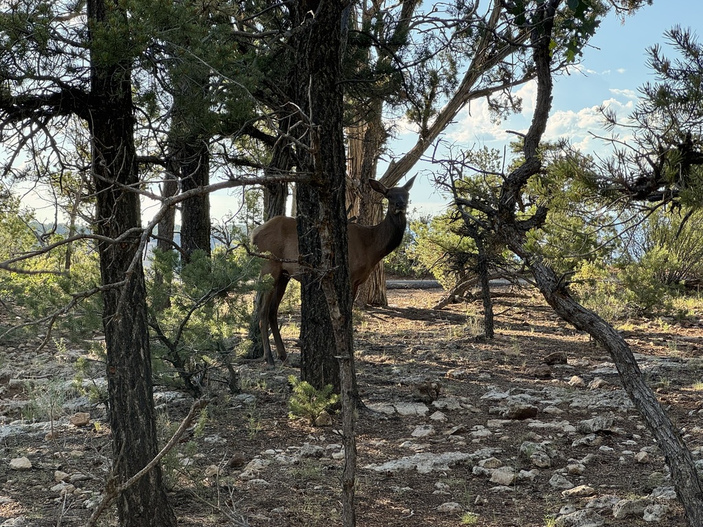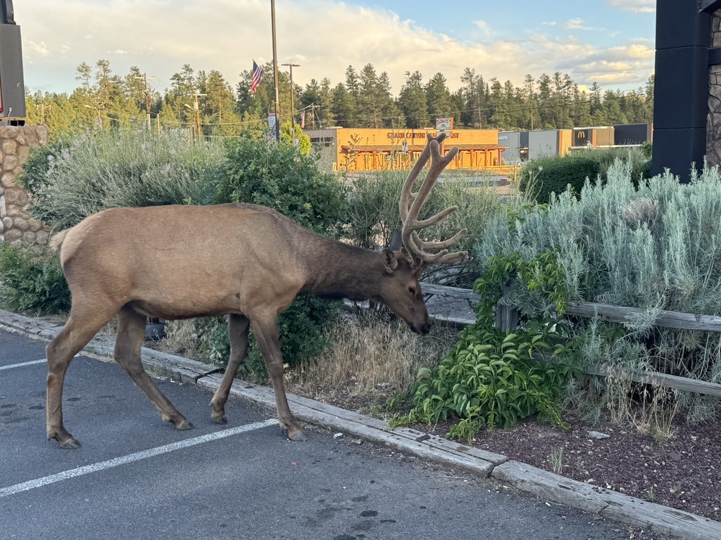 Das Abendessen erfolgte dann auf dem Rückweg vom Canyon im Foodie Club, einem Restaurant in der Nähe unseres Hotels. Auf dem Parkplatz des Restaurants wurden wir tatsächlich von einem großen Mule Deer („Maultierhirsch“) überrascht, welches viele Blicke (inkl. unseres neugierigen Ottifanten) auf sich zog 🙂