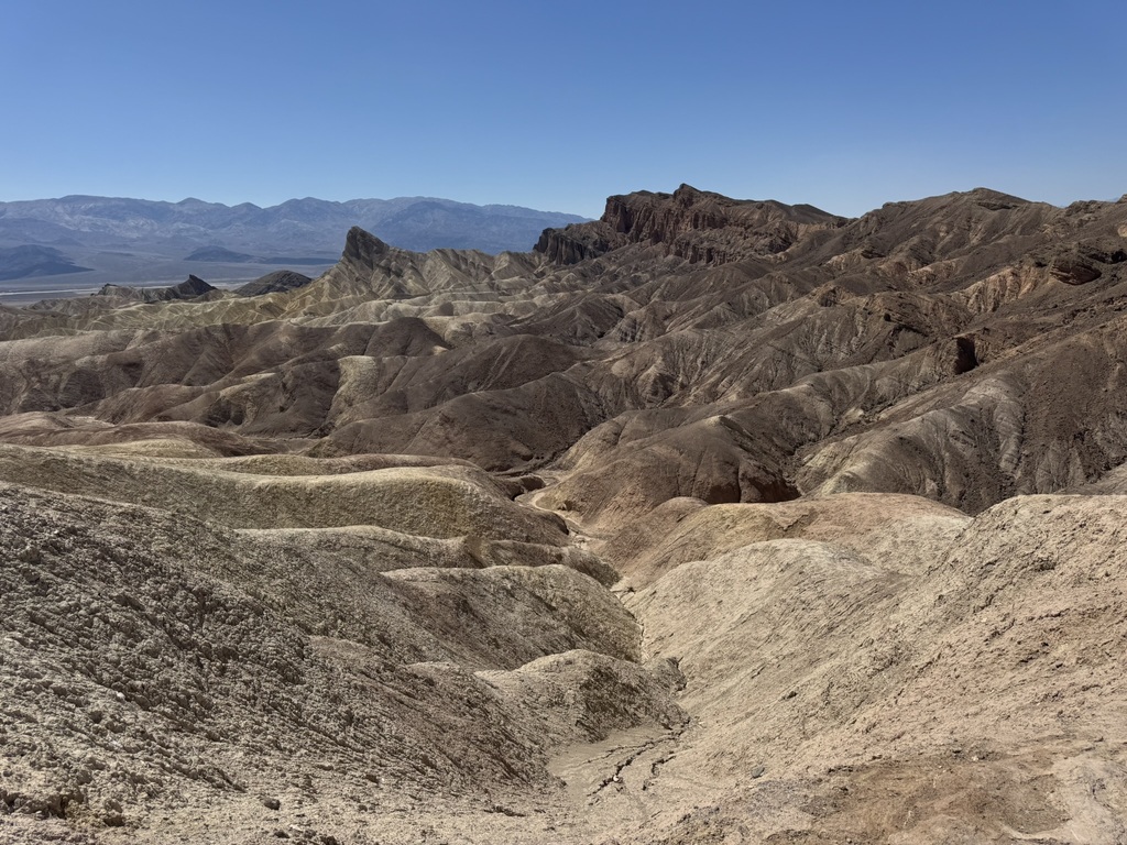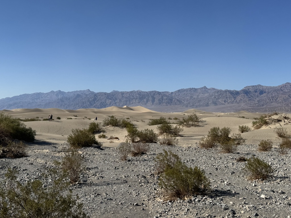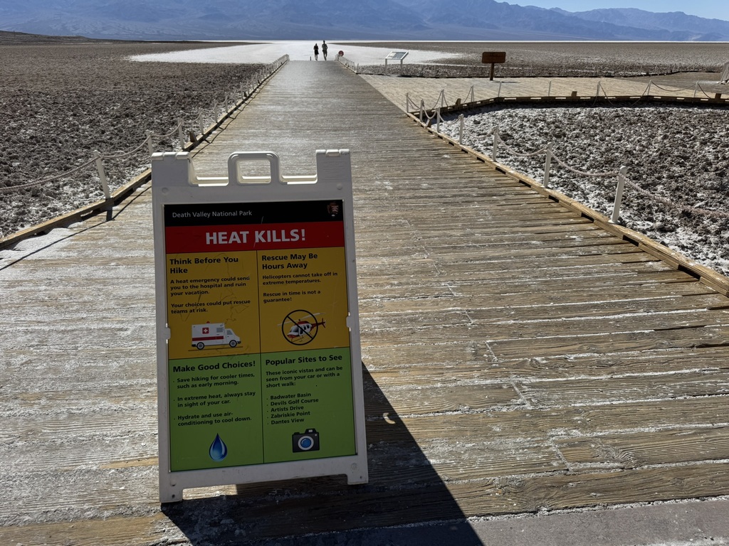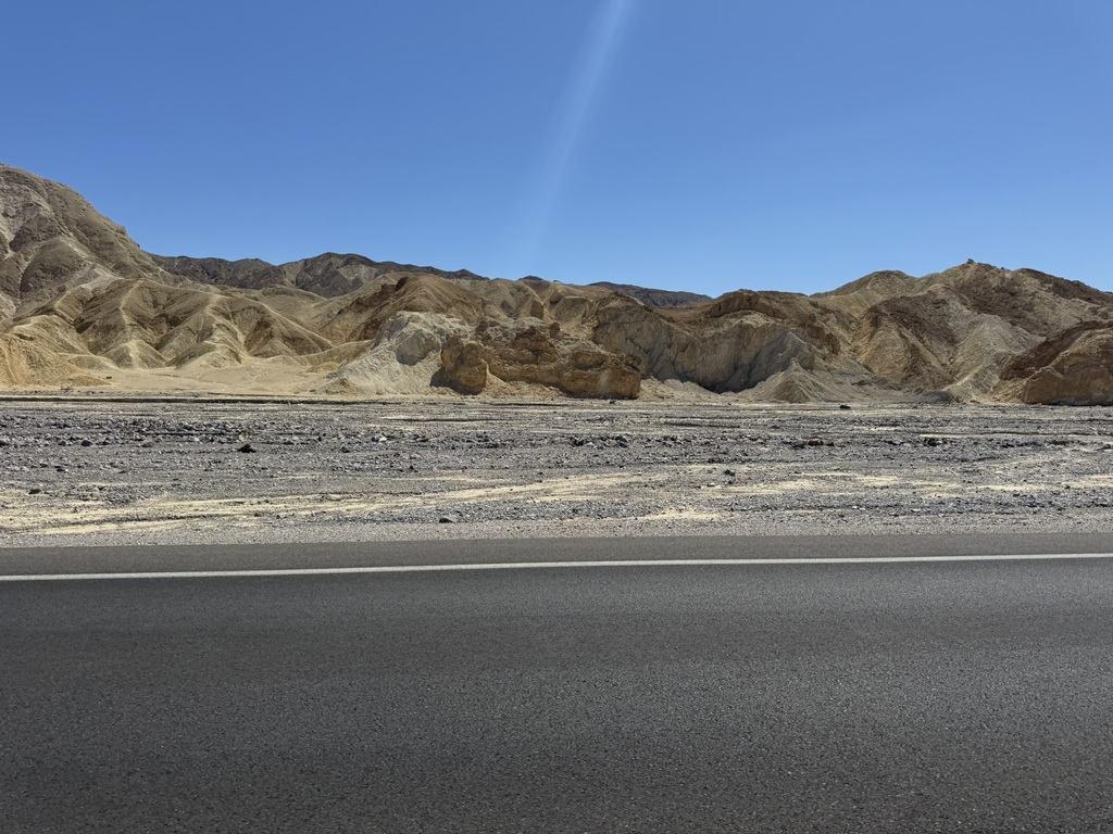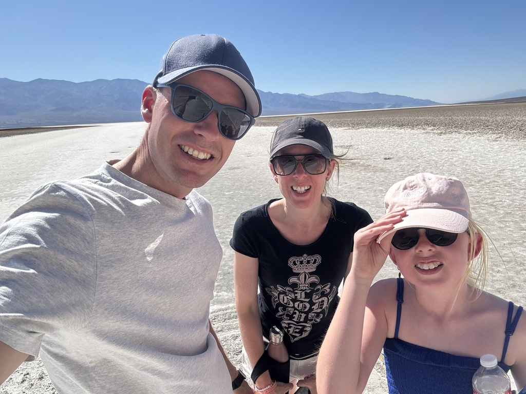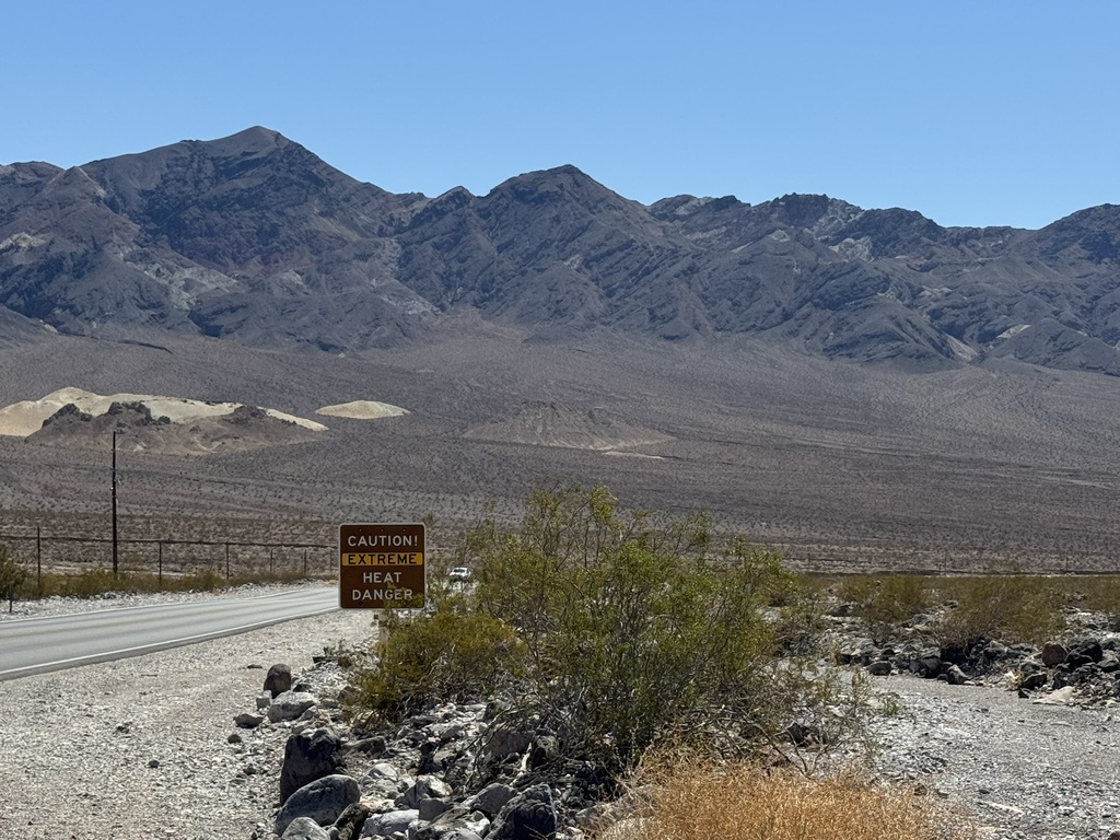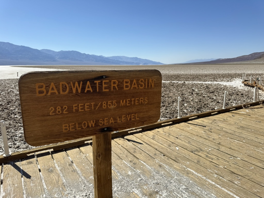 Nach circa zwei Stunden sind wir im Death Valley angekommen, wo es schon um die 40° waren, also schon sehr warm. Da wir aber genügend Wasser und Möglichkeiten zum Abkühlen dabei hatten (einen kleinen Ventilator mit Wasser), war es zwar immer noch sehr warm, aber es ging 😉 Im Death Valley sind wir dann noch etwas rumgefahren und haben dann noch den „Badwater Basin“ besucht (85,5 m unter dem Meeresspiegel, der niedrigste Punkt in Nordamerika!!!!). Dort waren es schon stolze 49°!!!