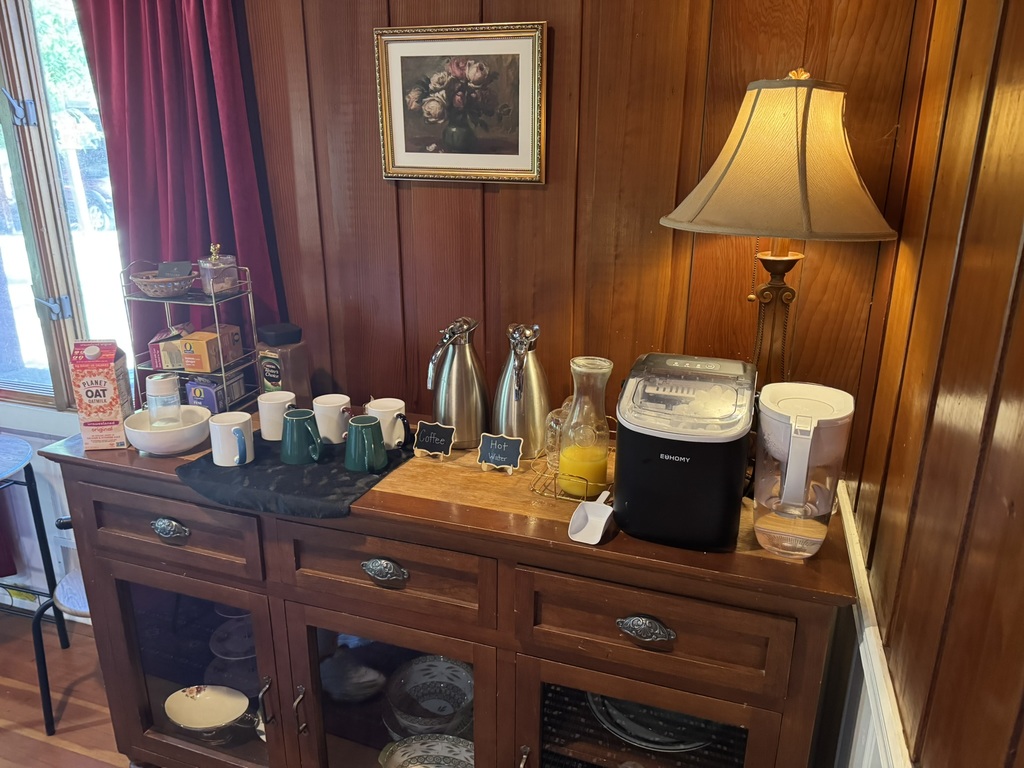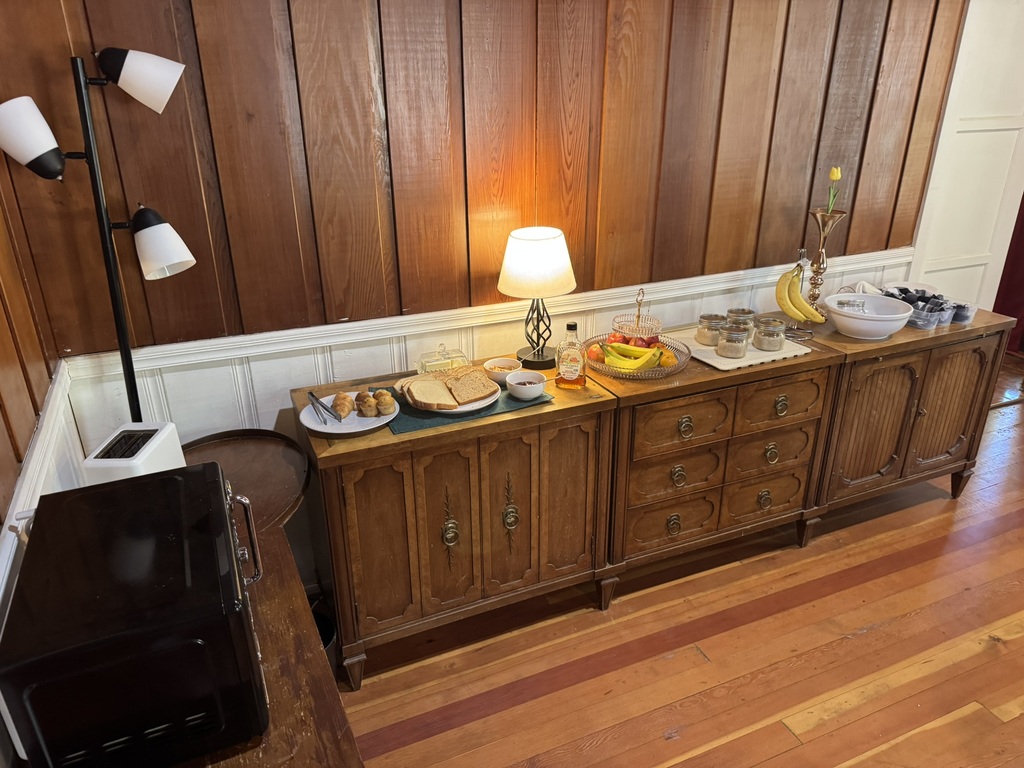 Das Frühstück war in einem Zimmer neben dem „Empfangsraum“. Dort saß noch eine andere Familie, die aber auch gegangen ist, als wir gekommen sind. Nun saßen wir also alleine an einer langen Tafel 😉 Es gab Joghurt, Toast, Orangensaft und Tee.