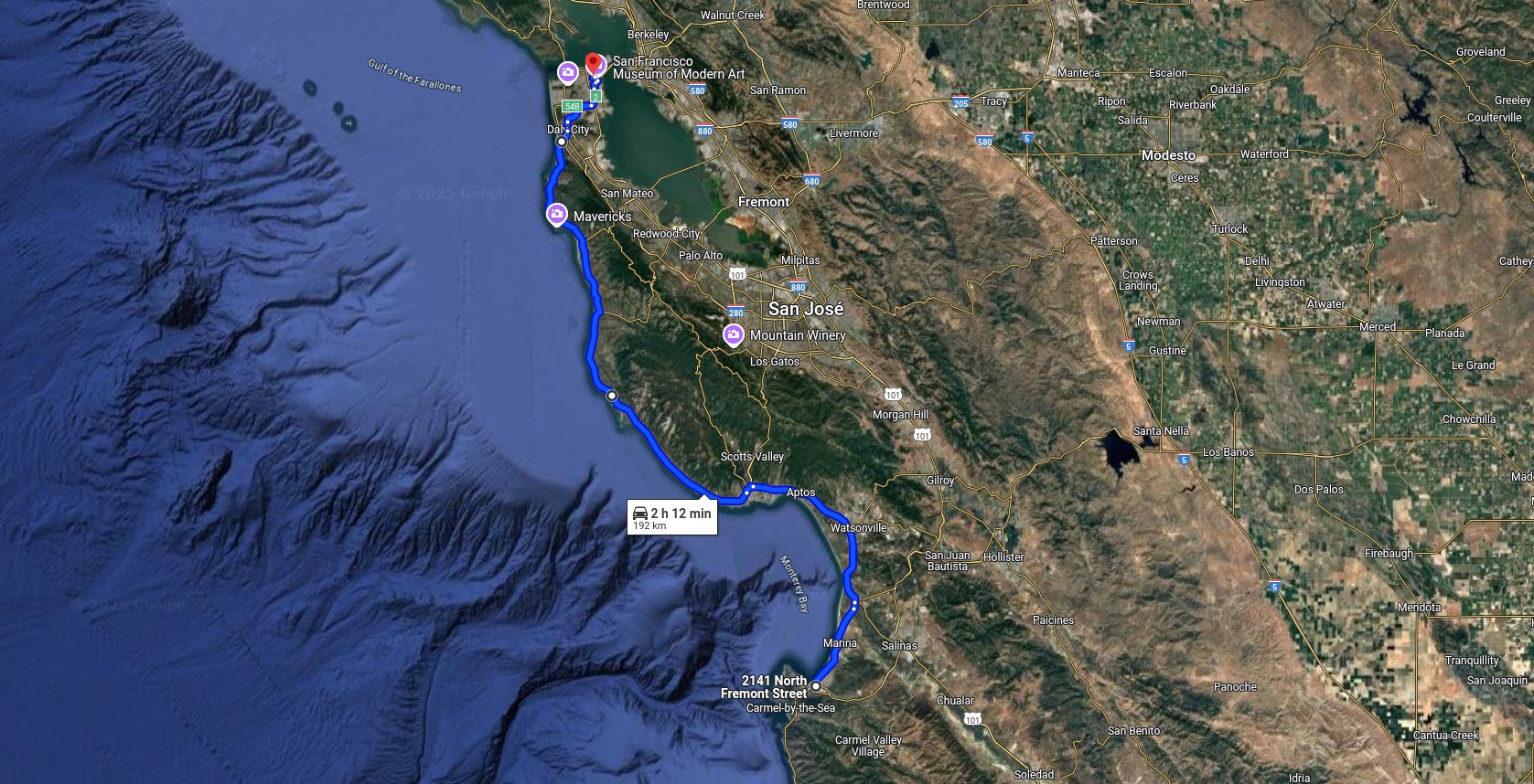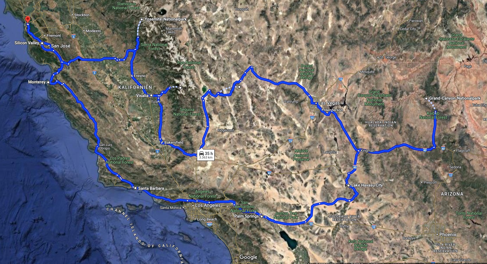Die tatsächliche Route wird etwas abweichend sein, da auf der Maps-Route der Highway 1 aktuell ausgelassen wird. Der Highway #1 erstreckt sich über 1.055km entlang der Westküste und ist mit seinen traumhaften Aussichten und Stränden ein „Muss“. Leider ist er aktuell in Richtung Süden größtenteils gesperrt, so dass wir eine kleine Strecke (bis zum „Big Sur“) doppelt fahren werden um zumindest ein paar Aussichtspunkte mitnehmen zu können.